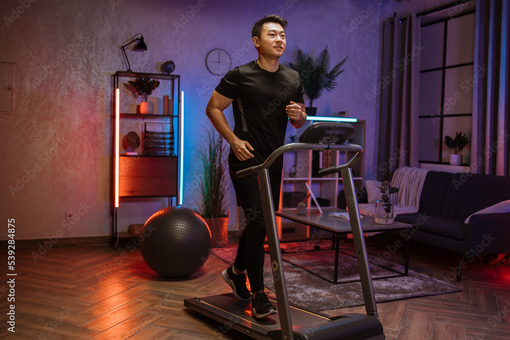 Attractive young sports asian man doing fitness exercise running on treadmill Athletic and muscular male having actively workout indoor at modern apartment at night time at home. Stock Photo Adobe Sto...